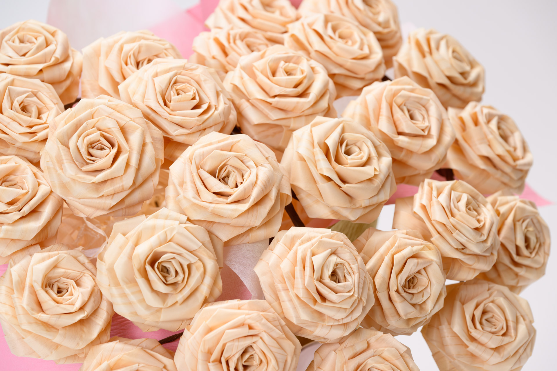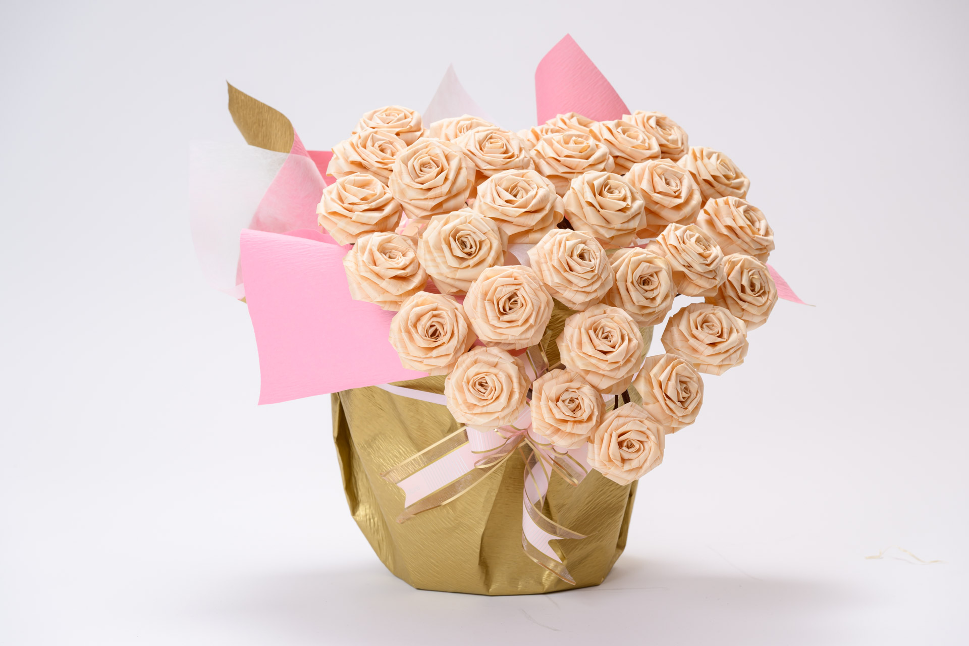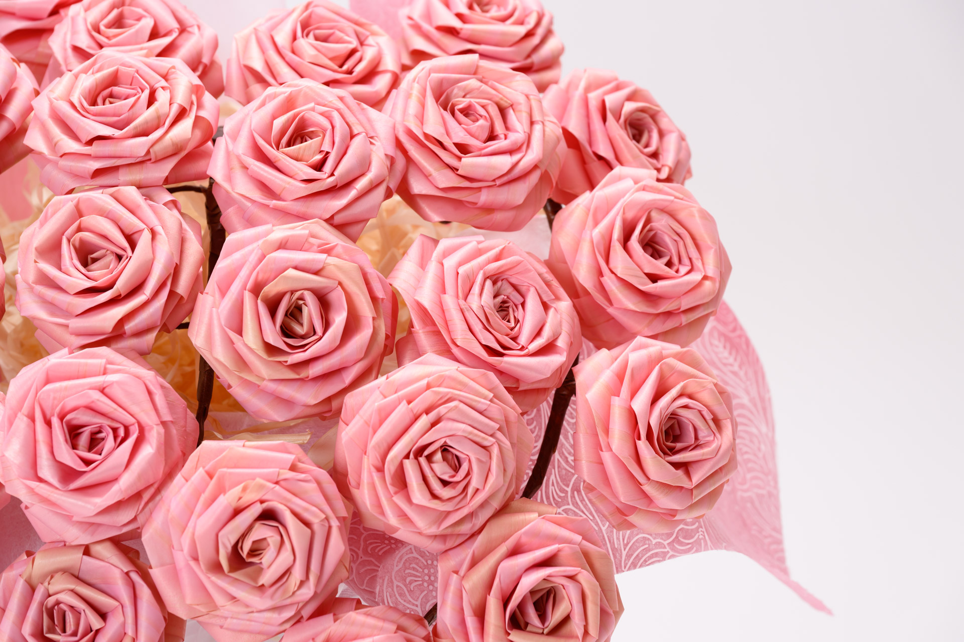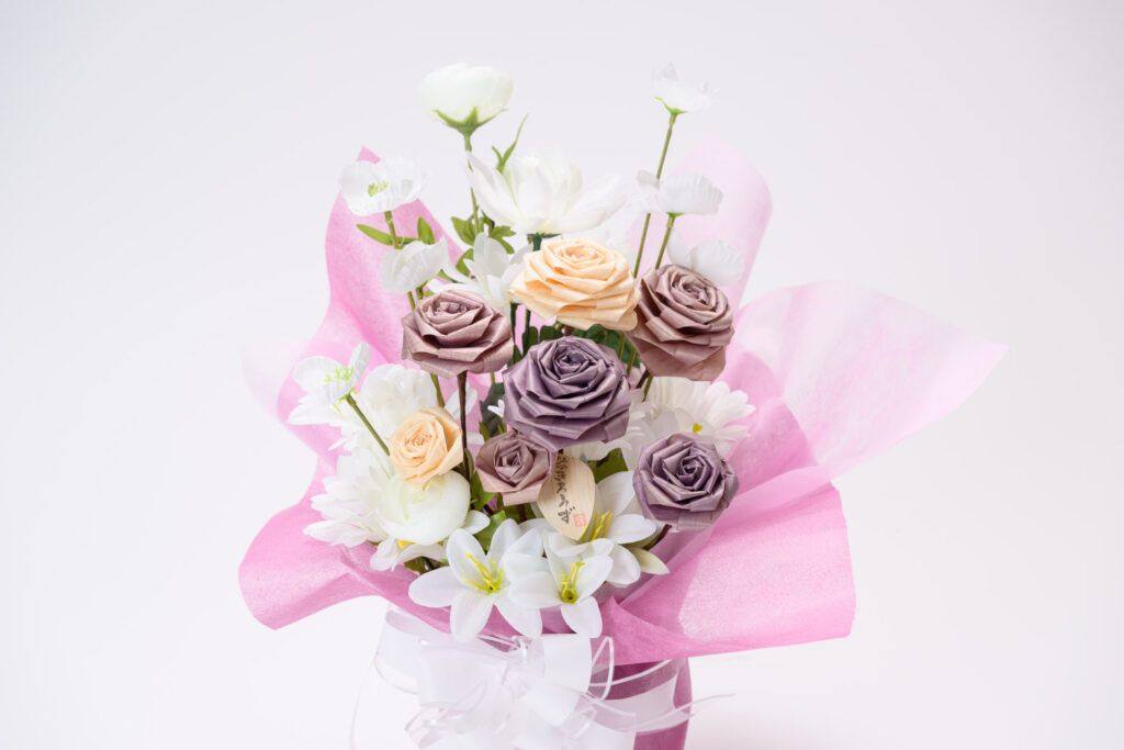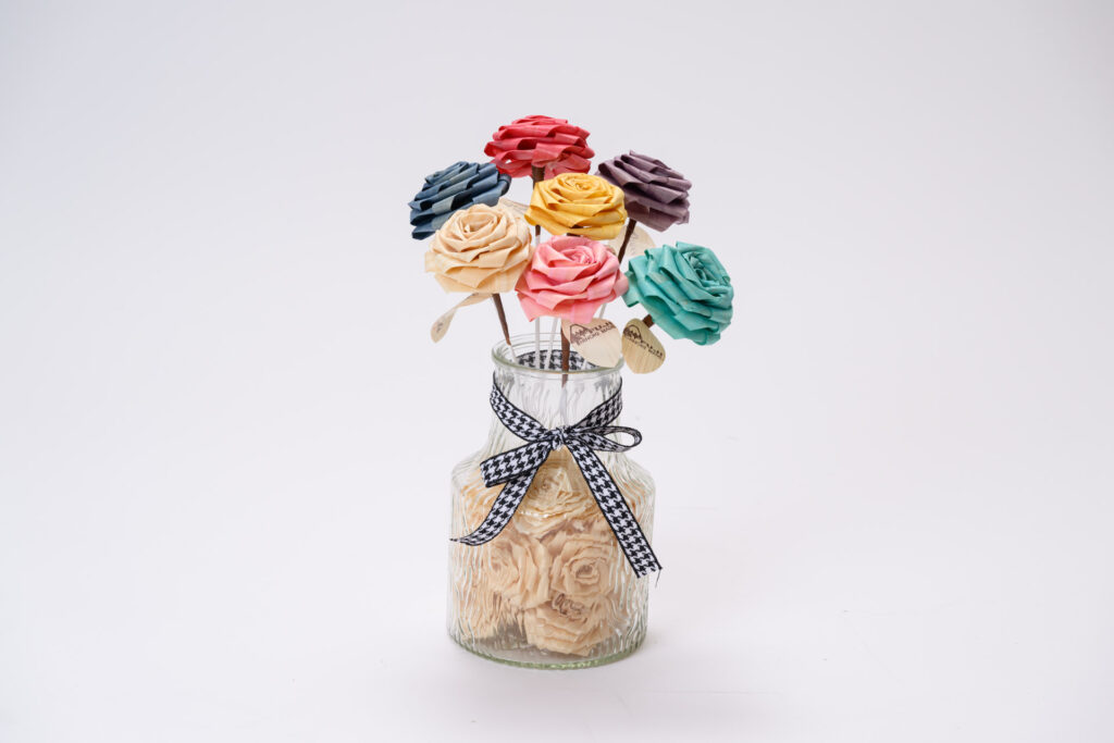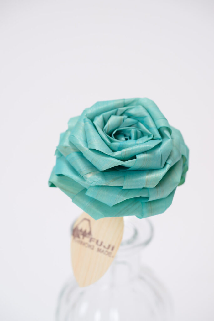 規格外の木材などの”かんなスライス”を再生してバラに一つ一つ折り上げた造花が「ひのきろうず」です。
