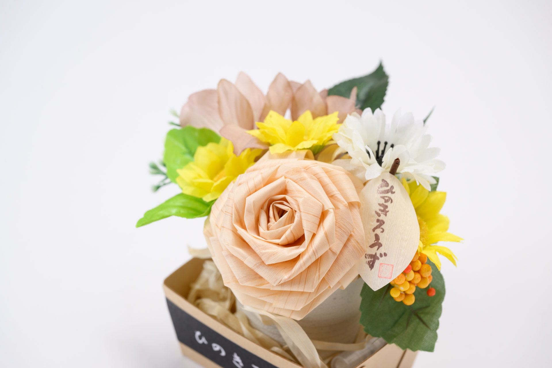 桧は日本に自生している固有の木材で、寺社仏閣に用いられる高級建材です。きめ細やかな木肌と美しい木目、防虫効果の他、抗菌、消臭効果のほか、香りにはリラックス効果があります。「ひのきろうず」は、飾って眺めて楽しんで、桧の香りに癒されます。
